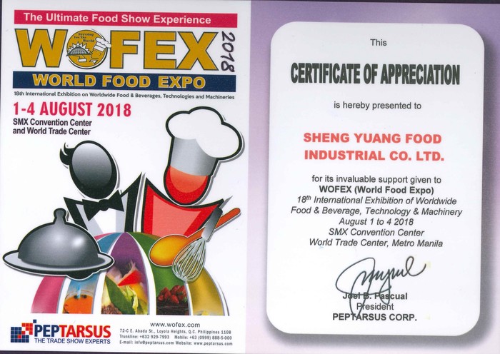 2018/8/1~4 至馬尼拉參加一年一度之食品展 (Philippines WOFEX during August.1-4, 2018),將優質的食品添加物工業技術及產品推廣至菲律賓市場。